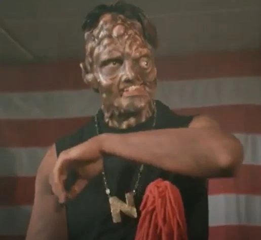 Tex Diaper is a minor antagonist in the movie. Leader of the terrorist group known as… the Diaper Mafia (Again, I did not make this up), he’s introduced in the opening scene invading the Tromaville school for the very special on Take a Mexican to Lunch Day, he’s first shown manically laughing while firing a gun, telling all the special needs kids to drop their tacos or he’ll blow their brains out. Quickly revealed to be working with Kazinski on his plan to bring a “new order” to Tromaville, he ends up murdering a special needs kid when Kazinski tells him to and promises to kill one every five minutes until a Really Real Bikini TV crew shows up. Later on he also brutally murders another kid for accidentally hitting him in the crotch, sadistically laughing the whole time, with it then being revealed he murdered a further three offscreen.