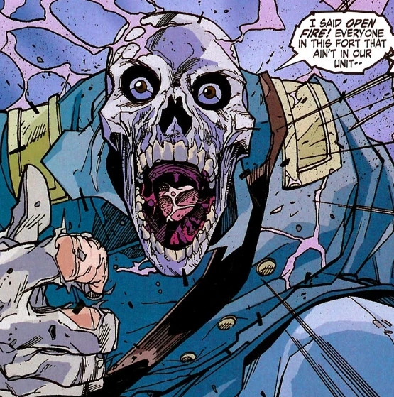A Union Army officer from the American Civil War, he and his soldiers, the Redlegs Regiment, are nothing more than war criminals, murdering innocent civilians and other people of different race. His interference in a ceremony turns him into a skull-faced terrorist.